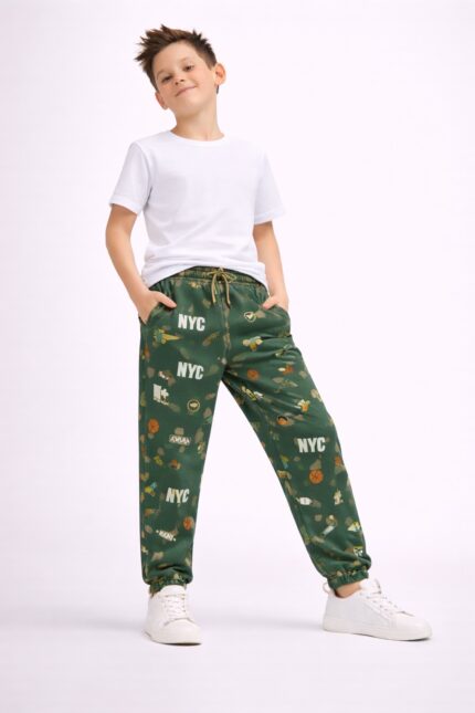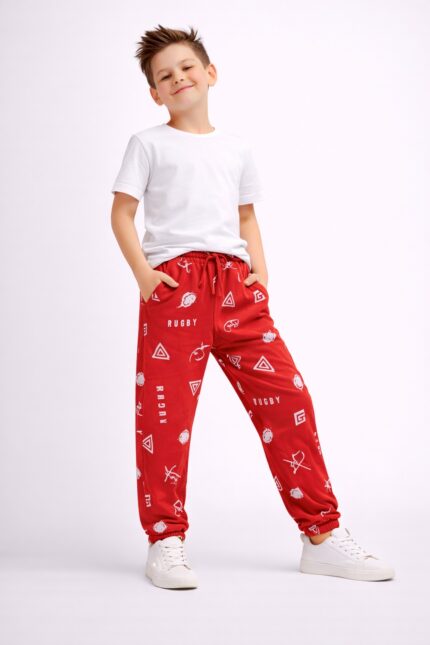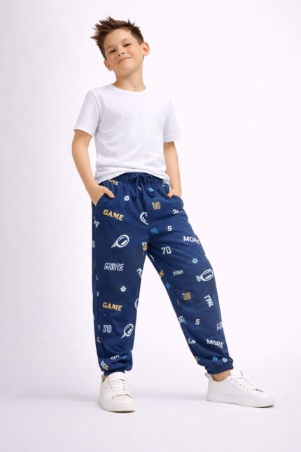 Give your kids a sporty and stylish upgrade with these all-over printed full-length pants, featuring bold elements like sports icons, numbers, “Game”, “More”, and athletic graphics. Designed for comfort and durability, these pants are perfect for daily wear, outings, and active play.