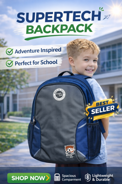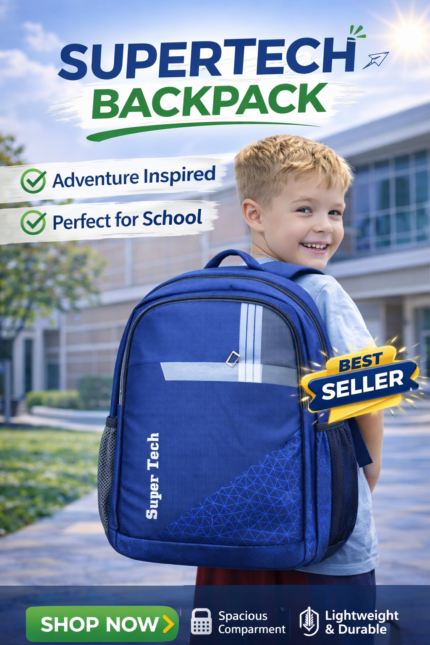 The Supertech Backpack is designed for durability, comfort, and everyday school use. Made with strong, lightweight fabric, it features spacious compartments to carry books, notebooks, and essentials easily. The padded shoulder straps ensure comfortable carrying, while the stylish design makes it perfect for students who want both functionality and a trendy look for school.