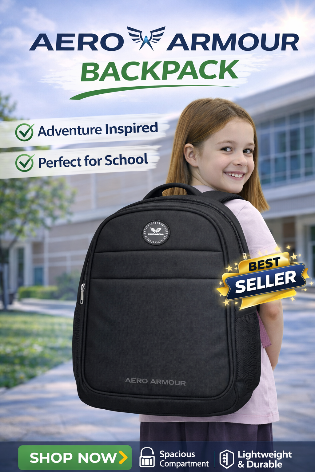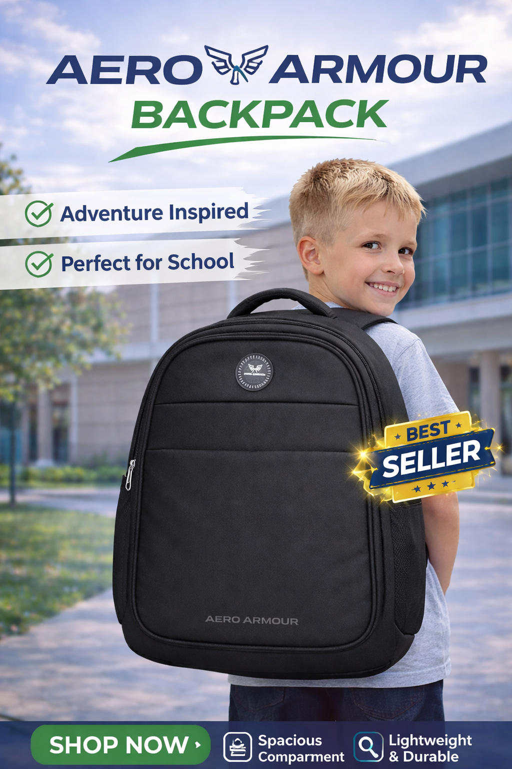 The Aero Armour Backpack is designed for durability, comfort, and everyday school use. Made with strong, lightweight fabric, it features spacious compartments to carry books, notebooks, and essentials easily. The padded shoulder straps ensure comfortable carrying, while the stylish design makes it perfect for students who want both functionality and a trendy look for school.