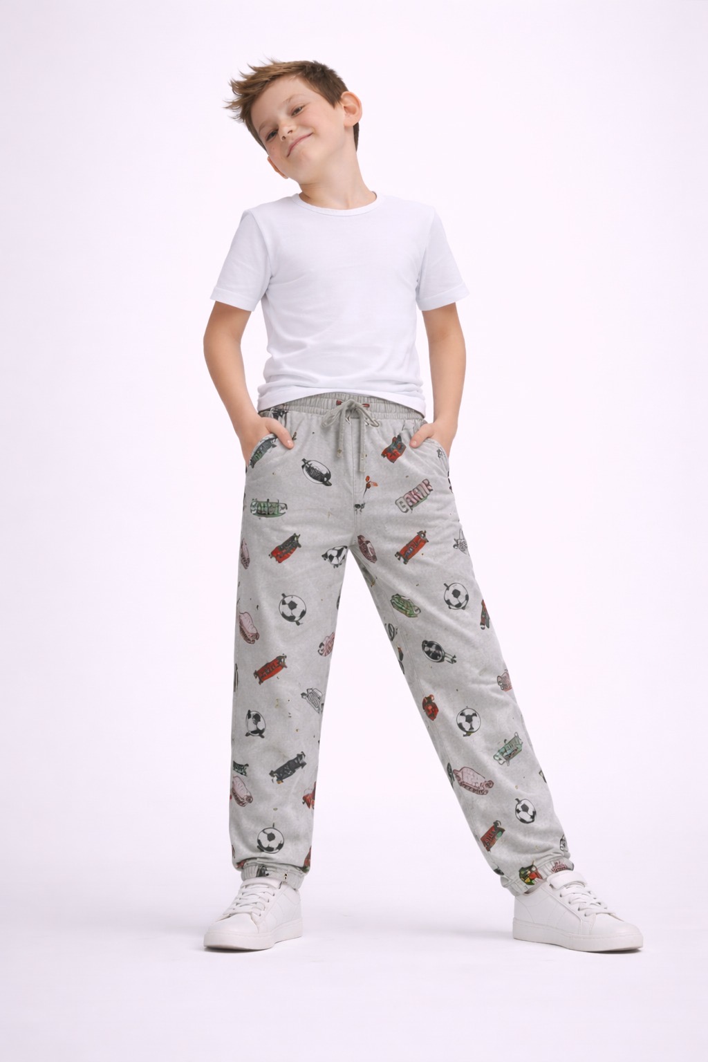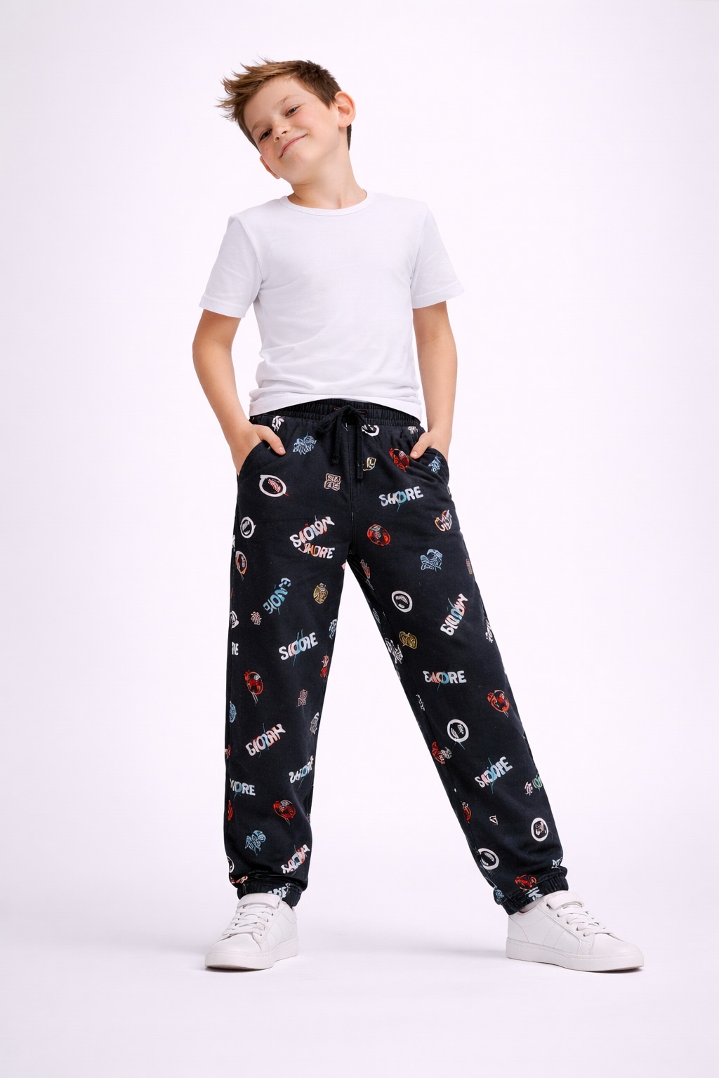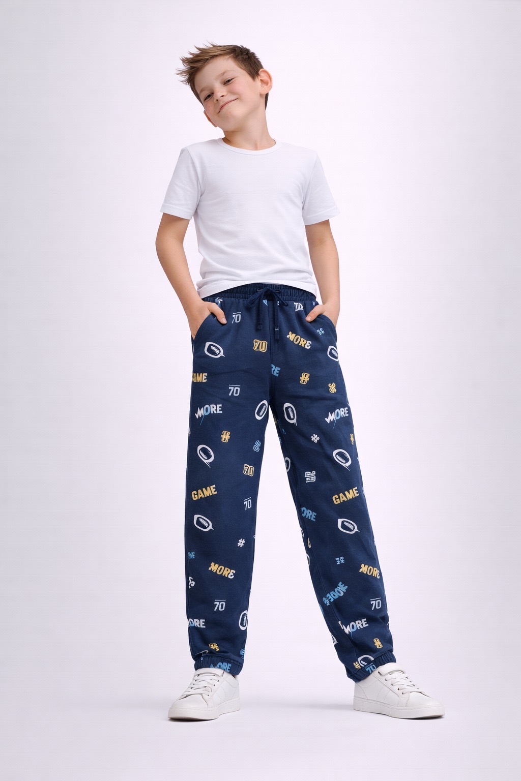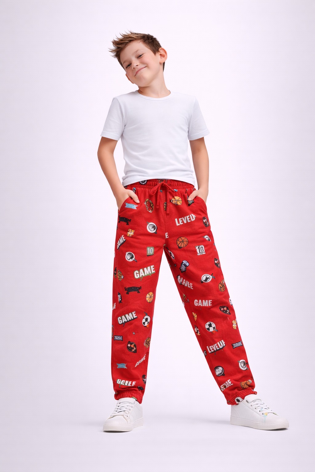 Give your kids a sporty and stylish upgrade with these all-over printed full-length pants, featuring bold elements like sports icons, numbers, “Game”, “More”, and athletic graphics. Designed for comfort and durability, these pants are perfect for daily wear, outings, and active play.