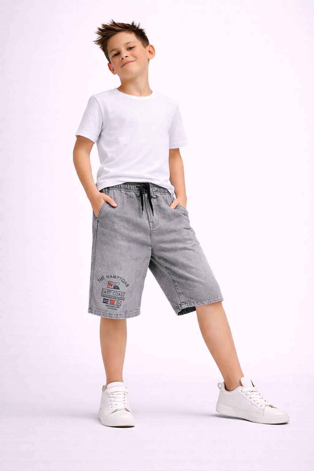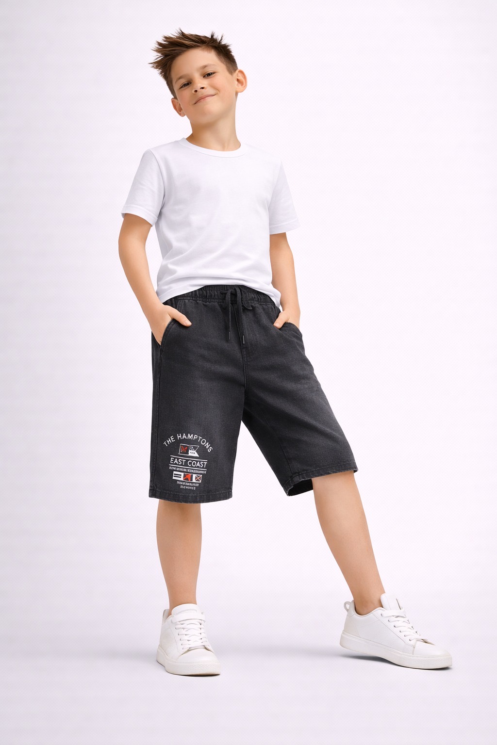 Upgrade your kids’ everyday style with these denim-look casual shorts, designed with a trendy washed finish and minimal branding print. These shorts offer the perfect mix of street style and comfort, making them ideal for daily wear, outings, and casual occasions.