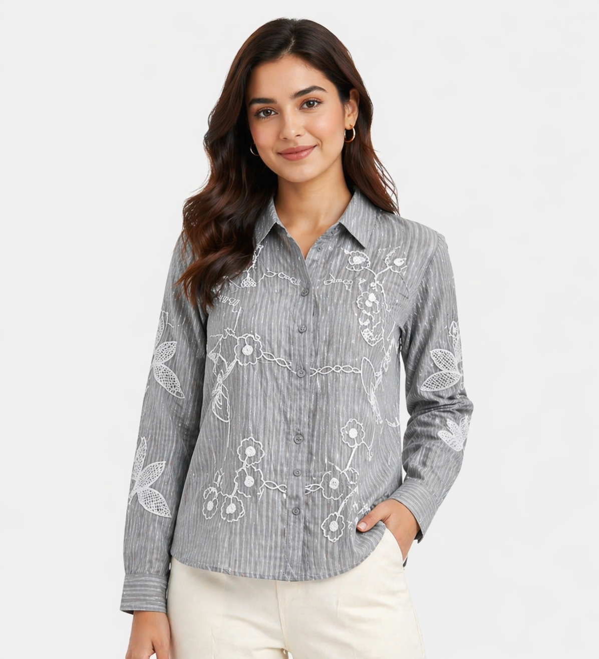 Add a touch of elegance to your wardrobe with this beautifully designed embroidered shirt. Featuring delicate floral thread work spread across the fabric, this top offers a soft, feminine, and premium look.