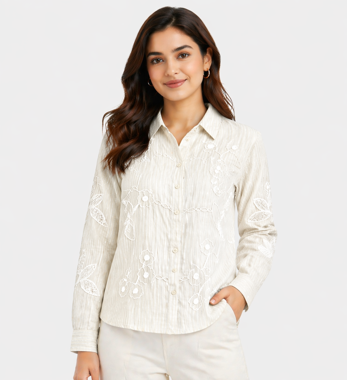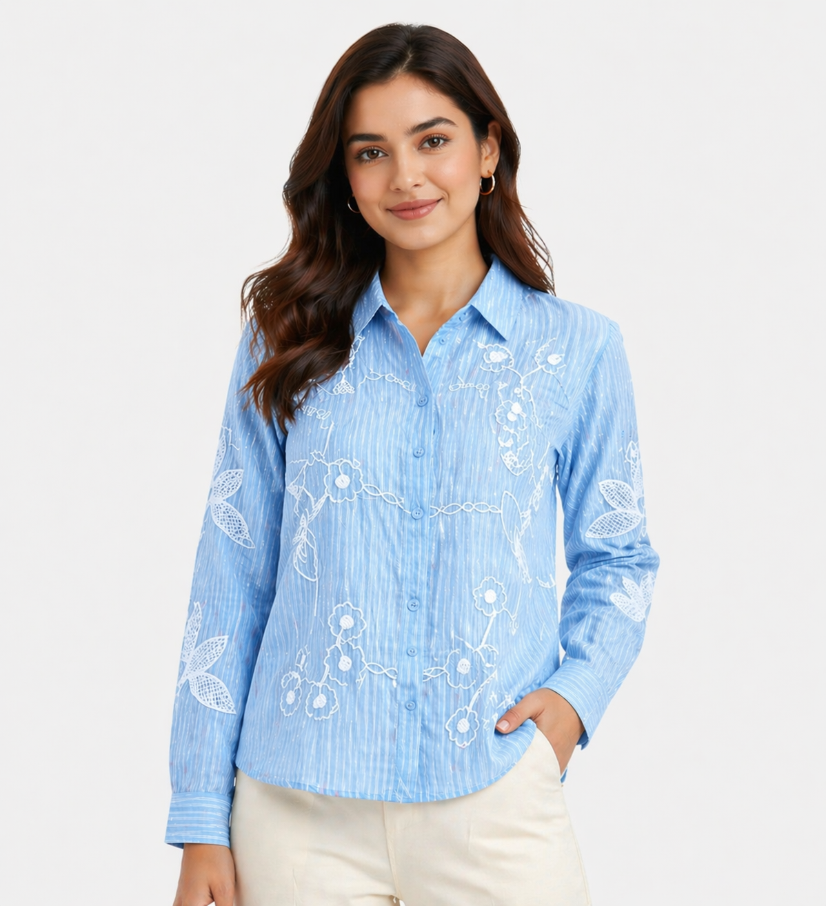Elevate your everyday style with this elegant floral embroidered top. Designed with beautiful thread embroidery on the front, this shirt offers a premium and graceful look. The soft textured fabric, stylish puff sleeves, and front button detailing make it perfect for casual outings, office wear, and festive styling.