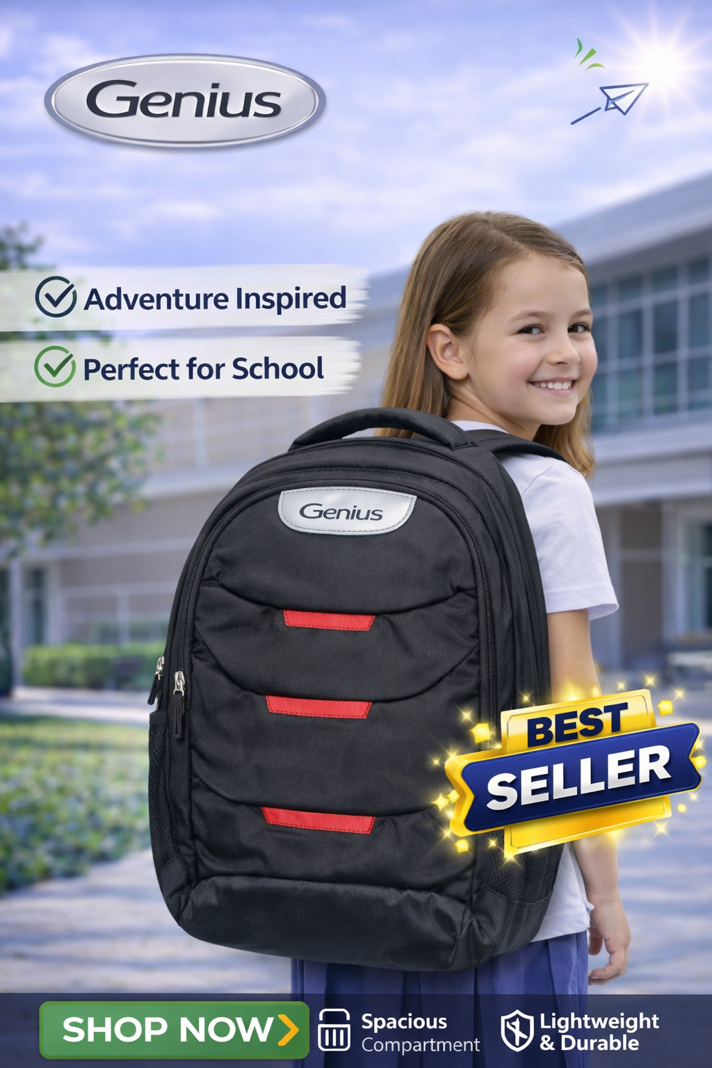The Genius Backpack is designed for durability, comfort, and everyday school use. Made with strong, lightweight fabric, it features spacious compartments to carry books, notebooks, and essentials easily. The padded shoulder straps ensure comfortable carrying, while the stylish design makes it perfect for students who want both functionality and a trendy look for school.