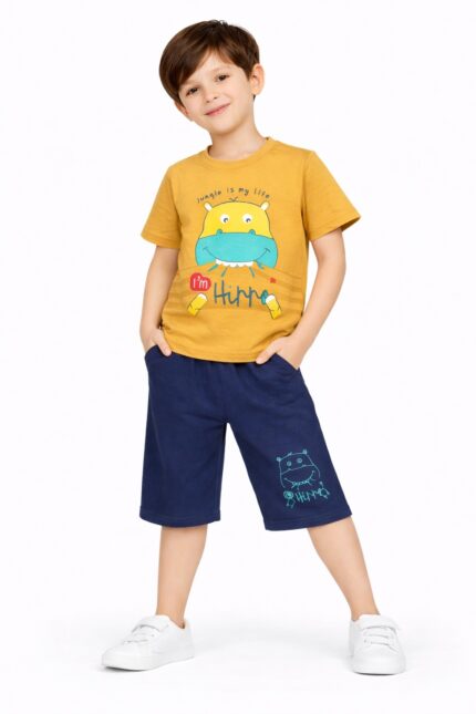 Made from soft and breathable fabric, the set ensures all-day comfort. The T-shirt comes with a round neck and short sleeves, while the matching shorts feature an elastic waistband for a snug and flexible fit.