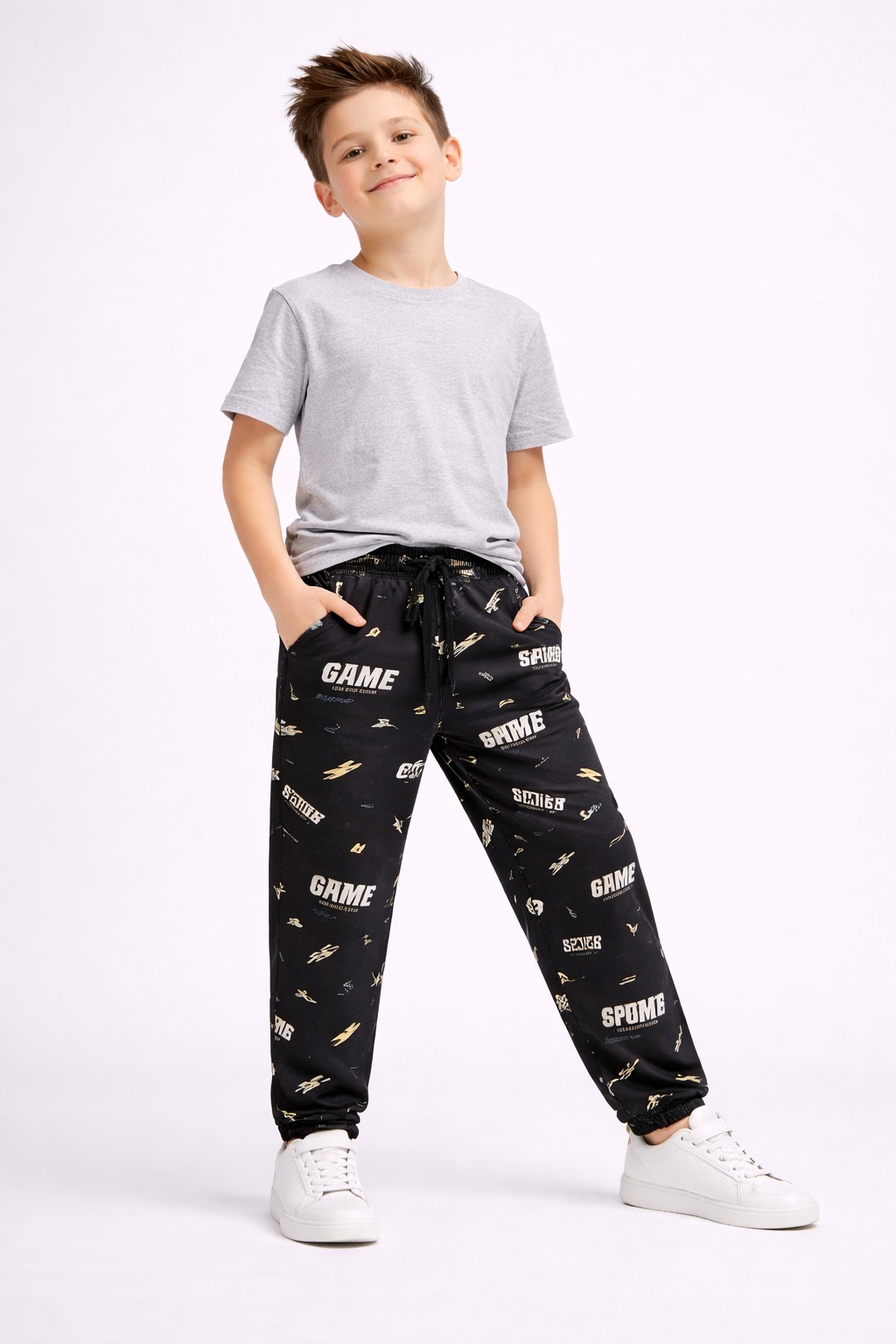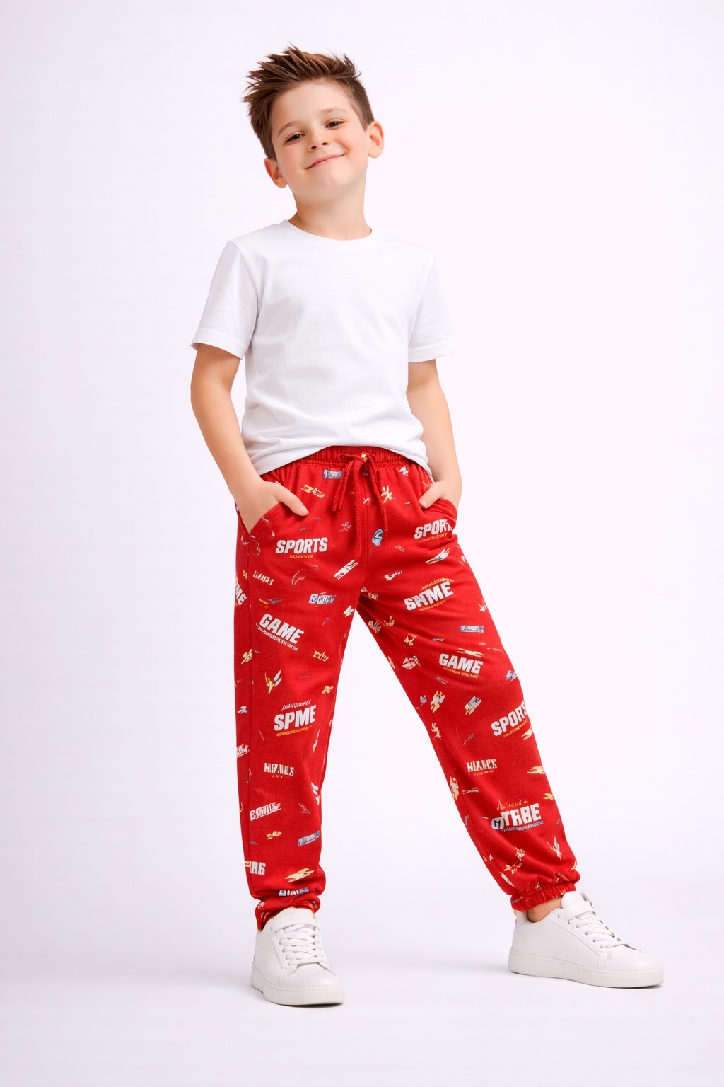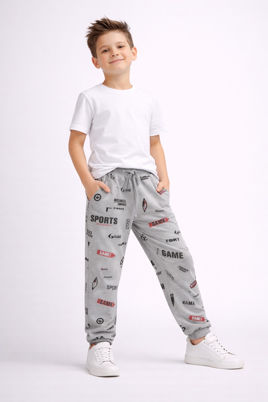 Bring sporty energy to your kids’ wardrobe with these game-themed printed track pants, featuring bold sports icons, typography like “GAME”, “MORE”, and numeric elements. Designed for comfort and style, these pants are perfect for daily wear, outdoor play, and casual outings.