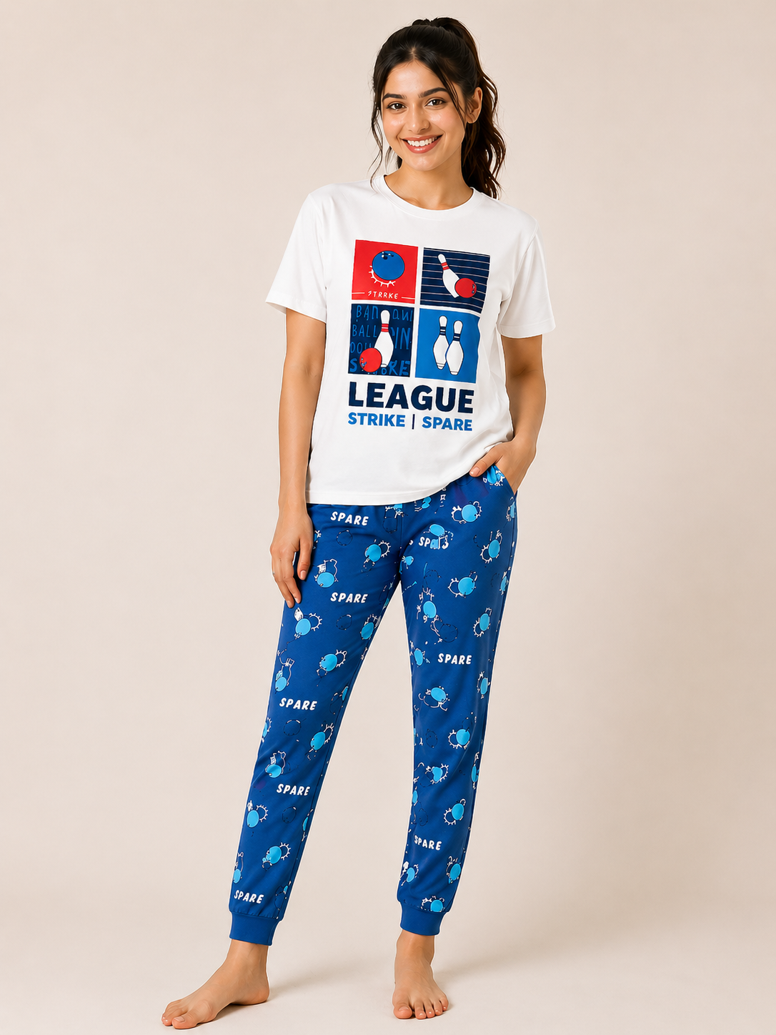 MountPeak premium lounge set featuring a sporty bowling graphic t-shirt with ultra-soft printed pajama lowers. Comfortable, breathable, and perfect for everyday lounging and sleepwear.