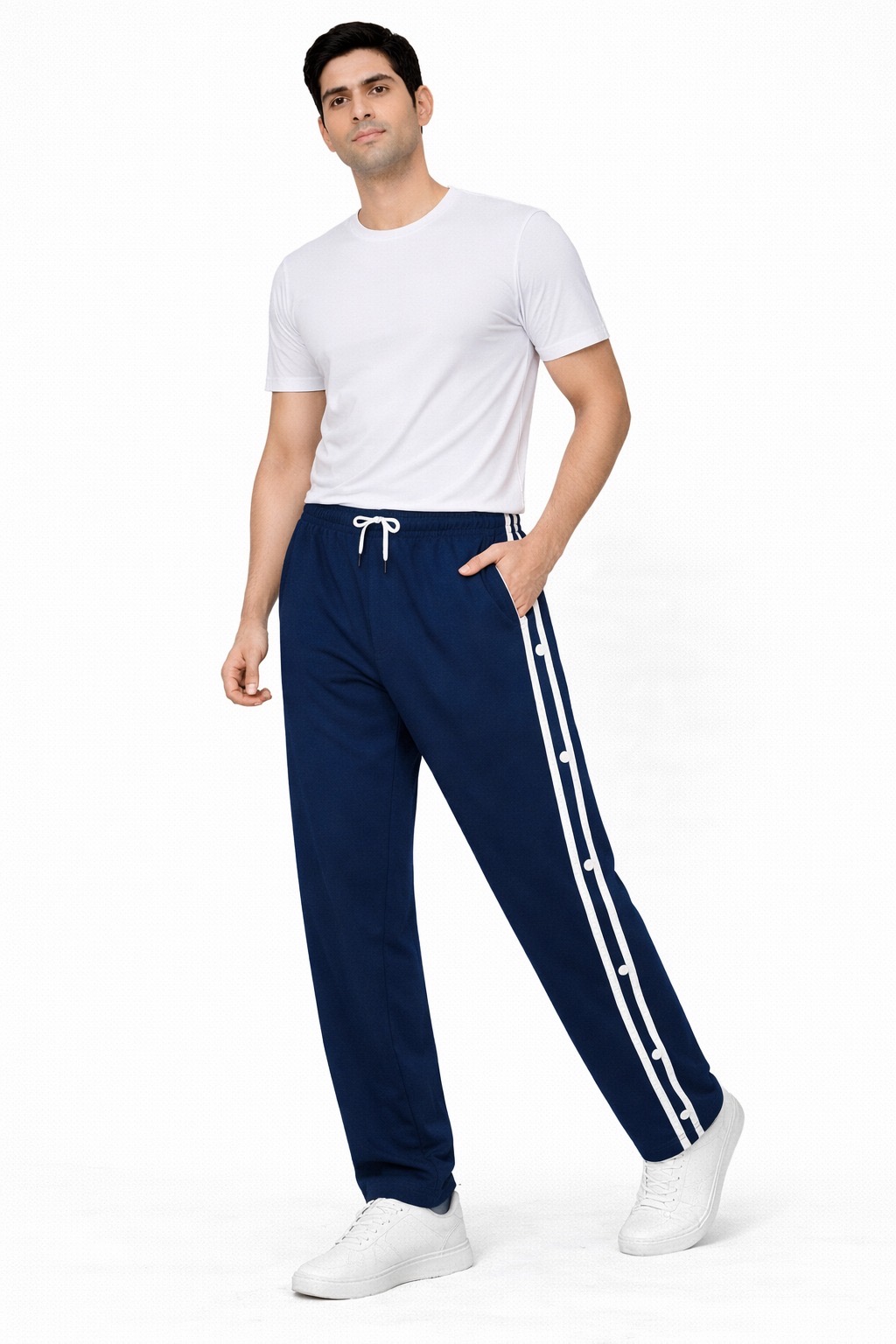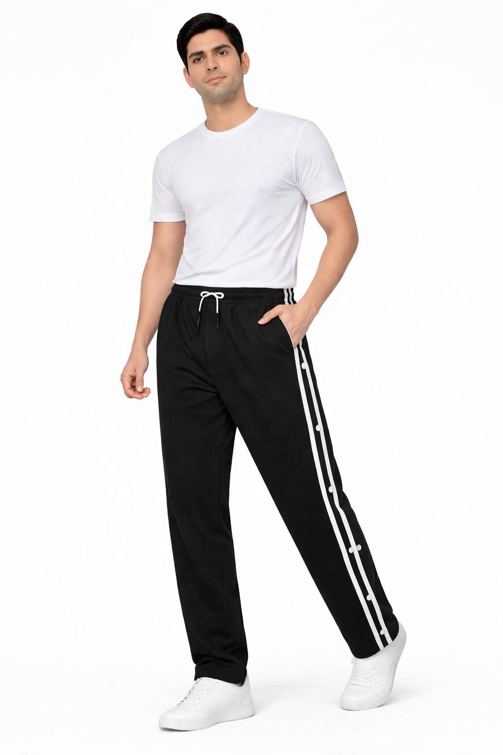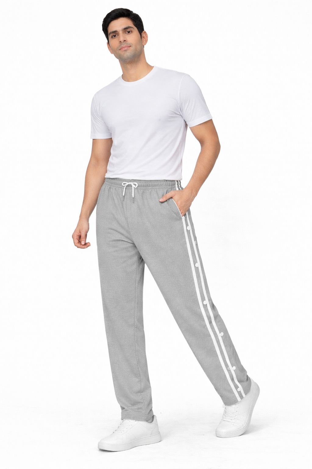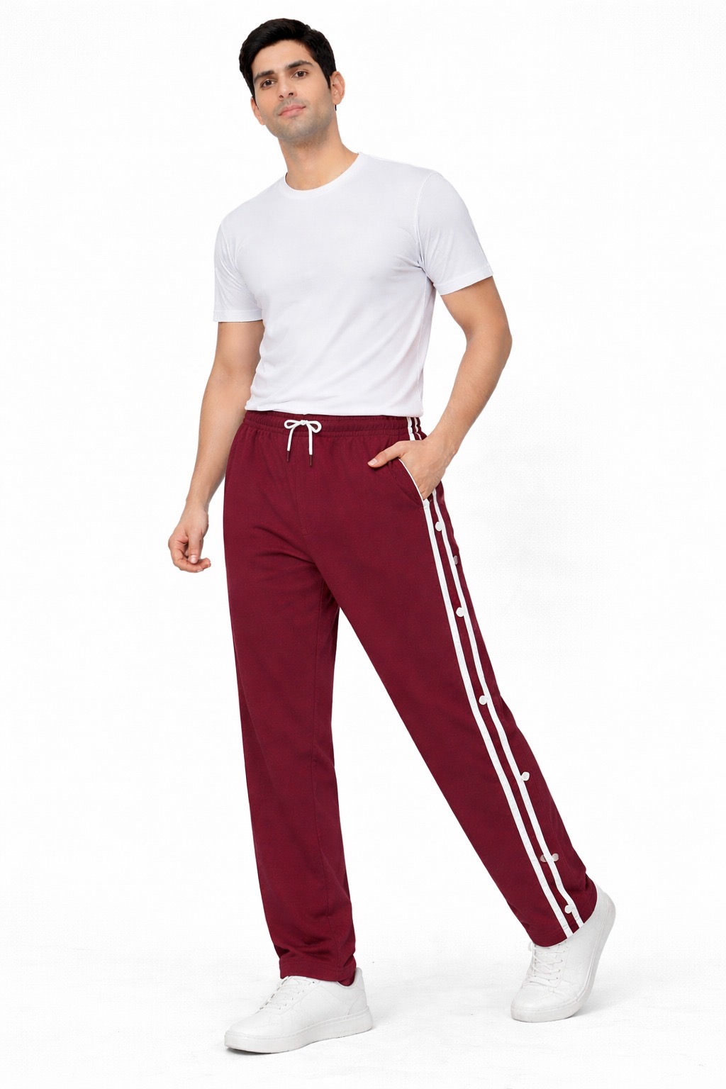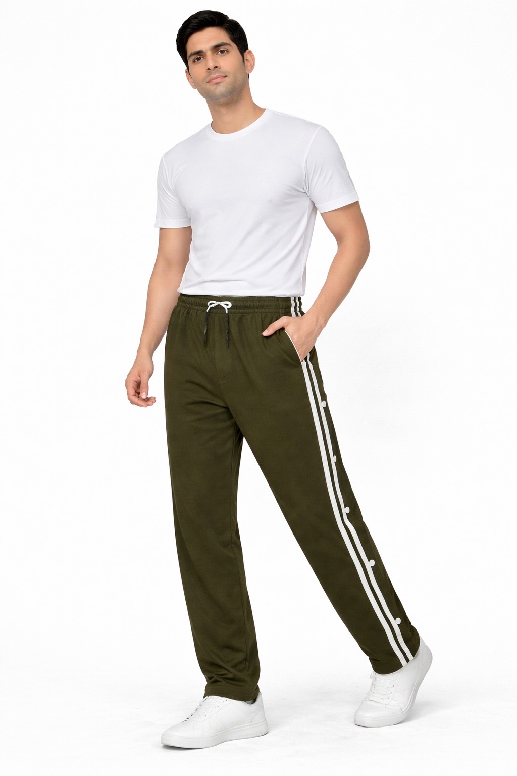 Upgrade your everyday style with these trendy side-button track pants designed for comfort and versatility. Featuring a sporty side stripe along with snap button detailing, these pants add a modern and premium touch to your casual look.