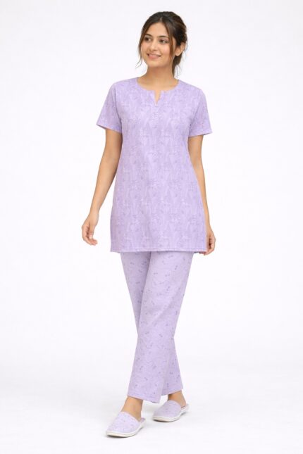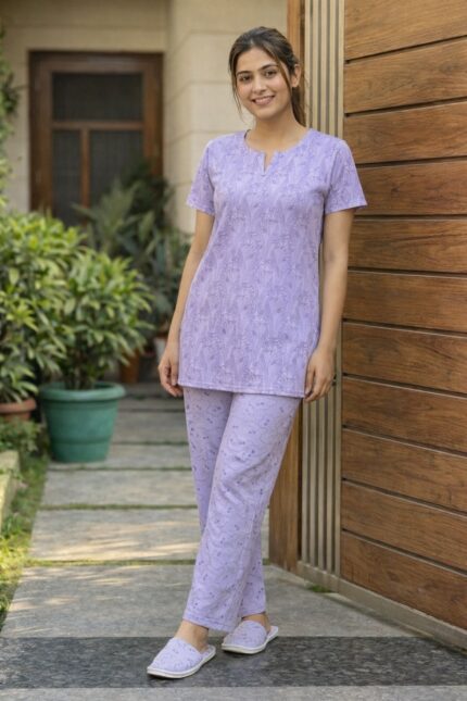 Refresh your everyday wardrobe with this elegant lavender lower suit set, designed for comfort, softness, and relaxed style. The subtle printed kurti-style top paired with matching bottoms creates a graceful and soothing look, perfect for both indoor relaxation and light outdoor wear.