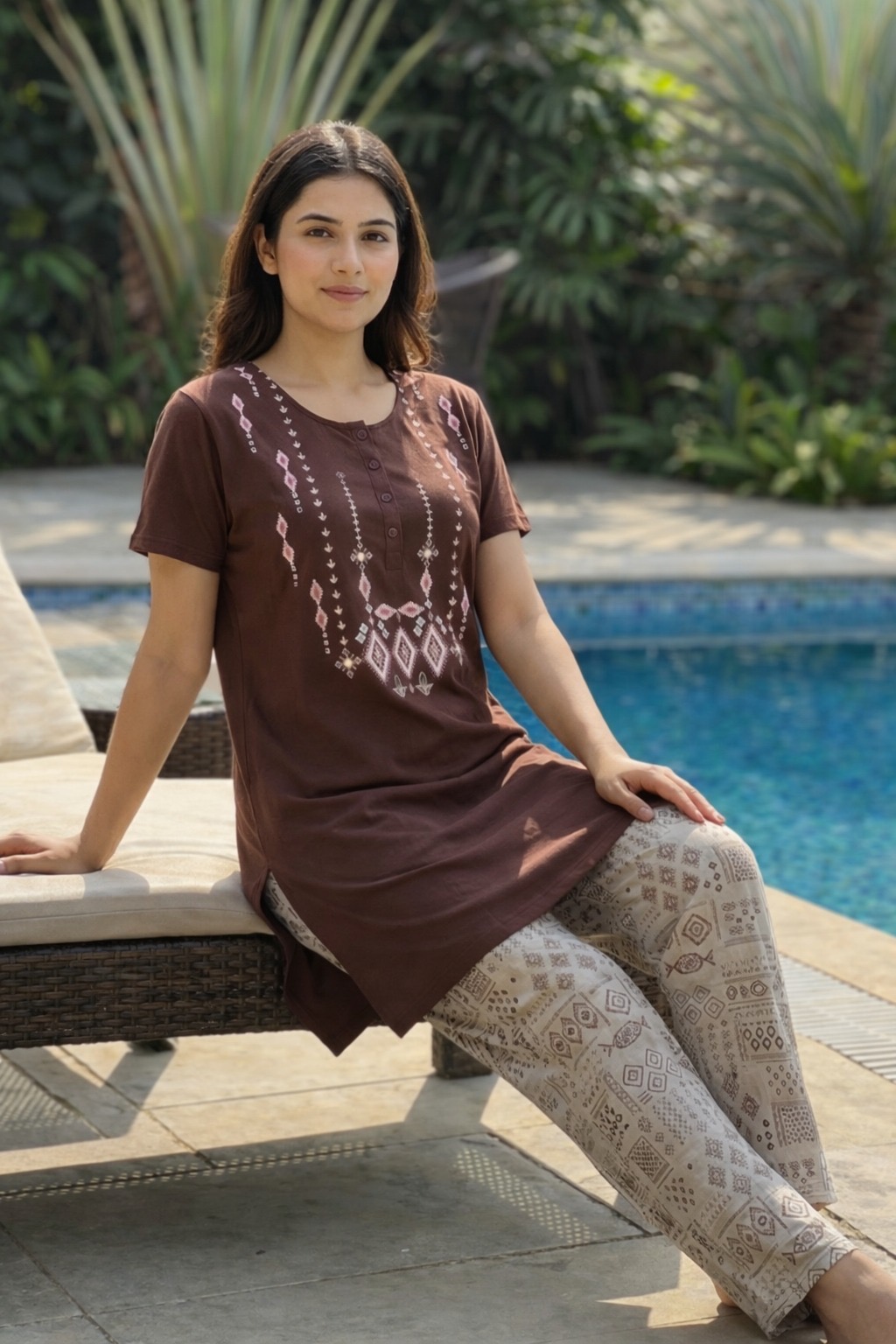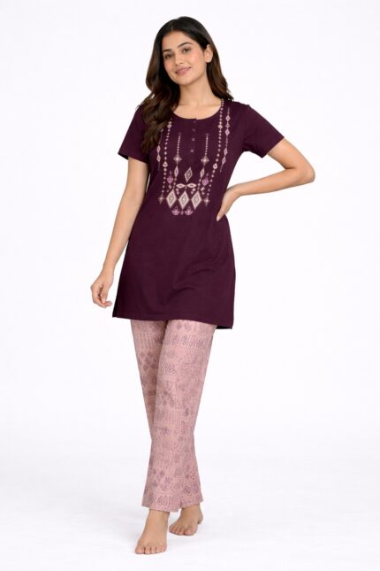 Upgrade your daily comfort with this wine-colored lower suit set, designed with ethnic-inspired front print detailing and soft printed lowers. The rich color tone gives a premium and classy home-wear feel, perfect for women who like comfort with style.