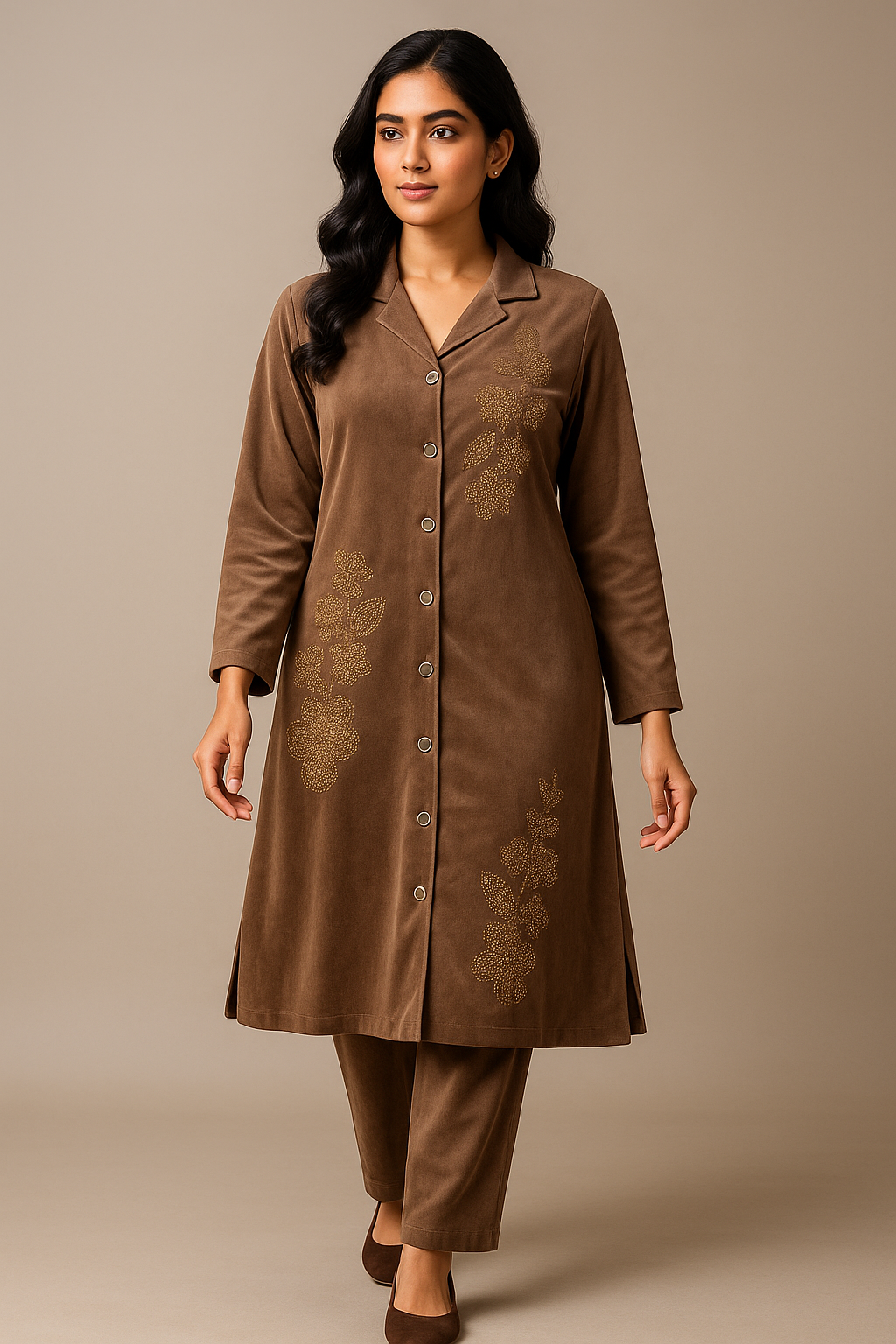 Velvet kurta plazo set premium quality Front neck and ghera embroidery with good stiching Pure velvet warm stuff