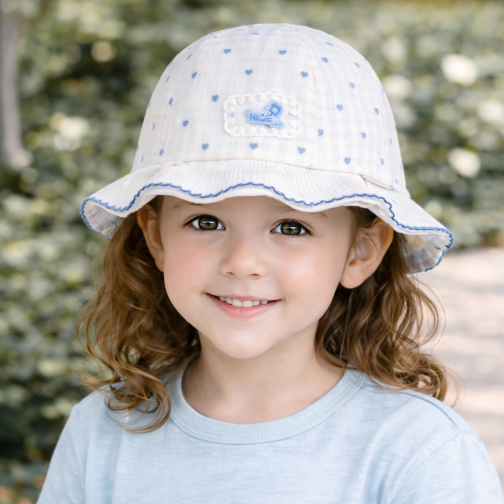 Add a soft and stylish touch to your childβs summer look with our elegant Frill Edge Bucket Cap. Designed with delicate heart patterns, subtle embroidery, and a charming wavy brim, this cap is perfect for both comfort and cuteness.