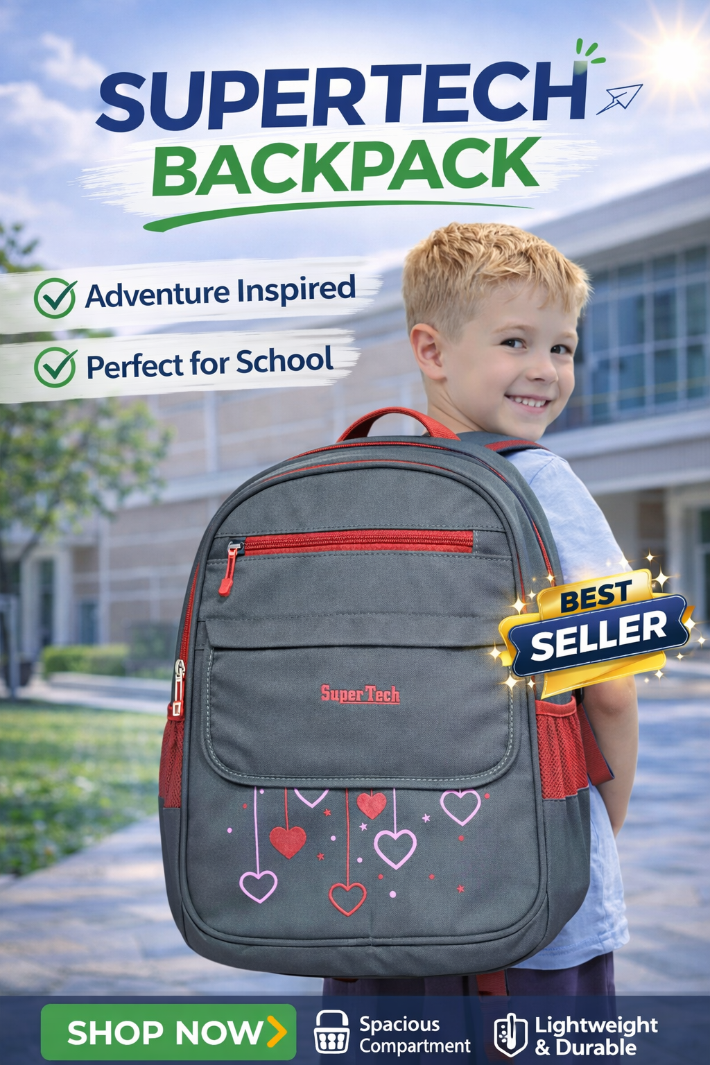 The Supertech Backpack is designed for durability, comfort, and everyday school use. Made with strong, lightweight fabric, it features spacious compartments to carry books, notebooks, and essentials easily. The padded shoulder straps ensure comfortable carrying, while the stylish design makes it perfect for students who want both functionality and a trendy look for school.