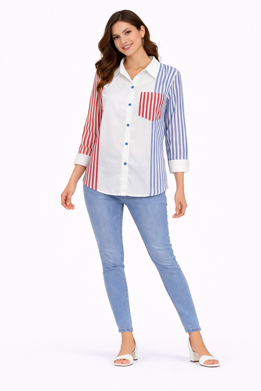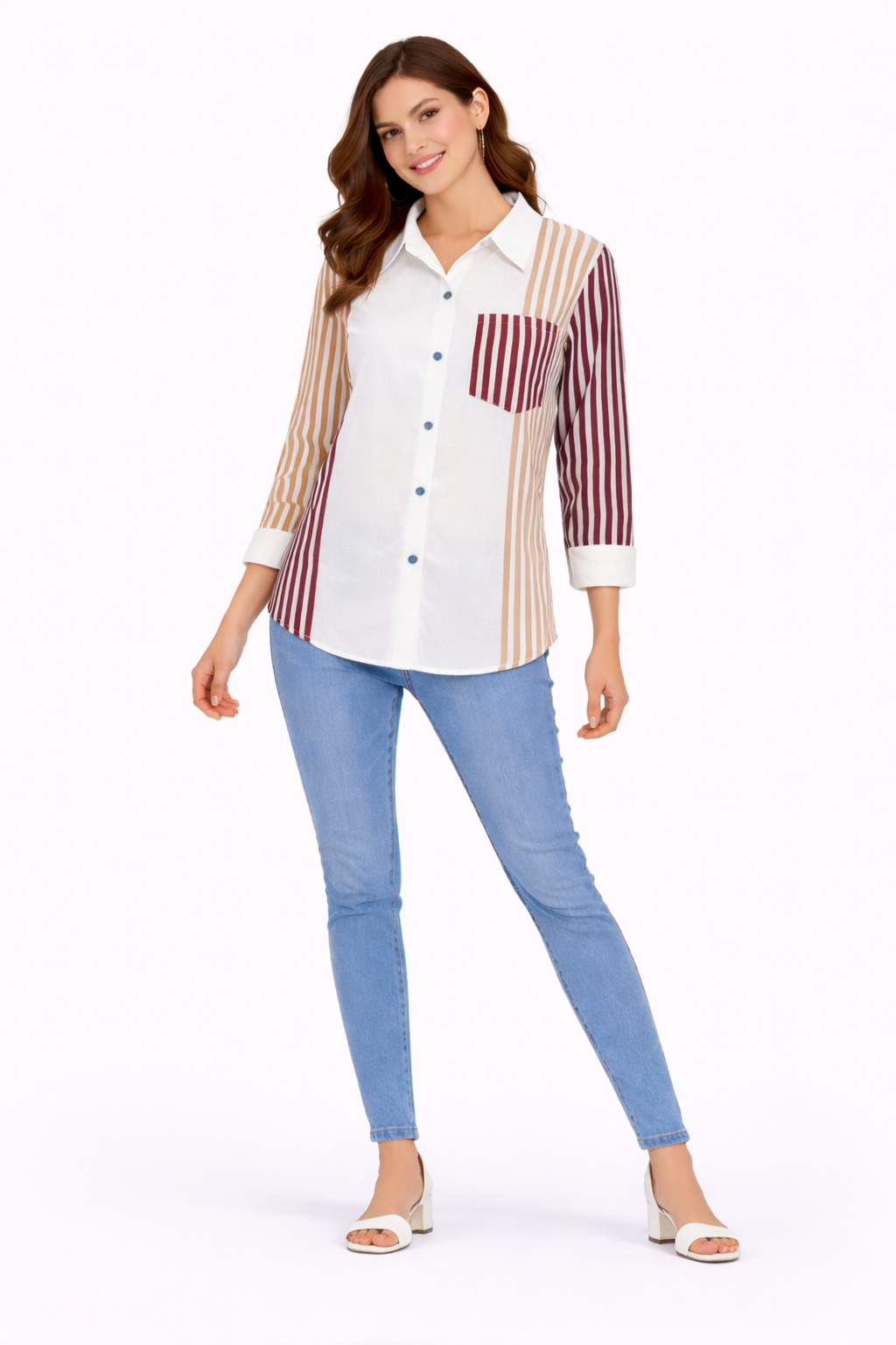 Upgrade your wardrobe with this trendy color-block striped shirt designed for a modern and stylish look. Featuring a unique combination of vertical stripes with a contrast pocket, this shirt adds a fresh and fashionable touch to your everyday outfit.