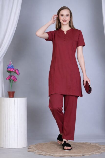 Crafted from soft, breathable fabric, the outfit ensures all-day ease while maintaining a clean, structured look. The rich maroon tone adds a premium and stylish appeal, making it a must-have in your daily wear collection.