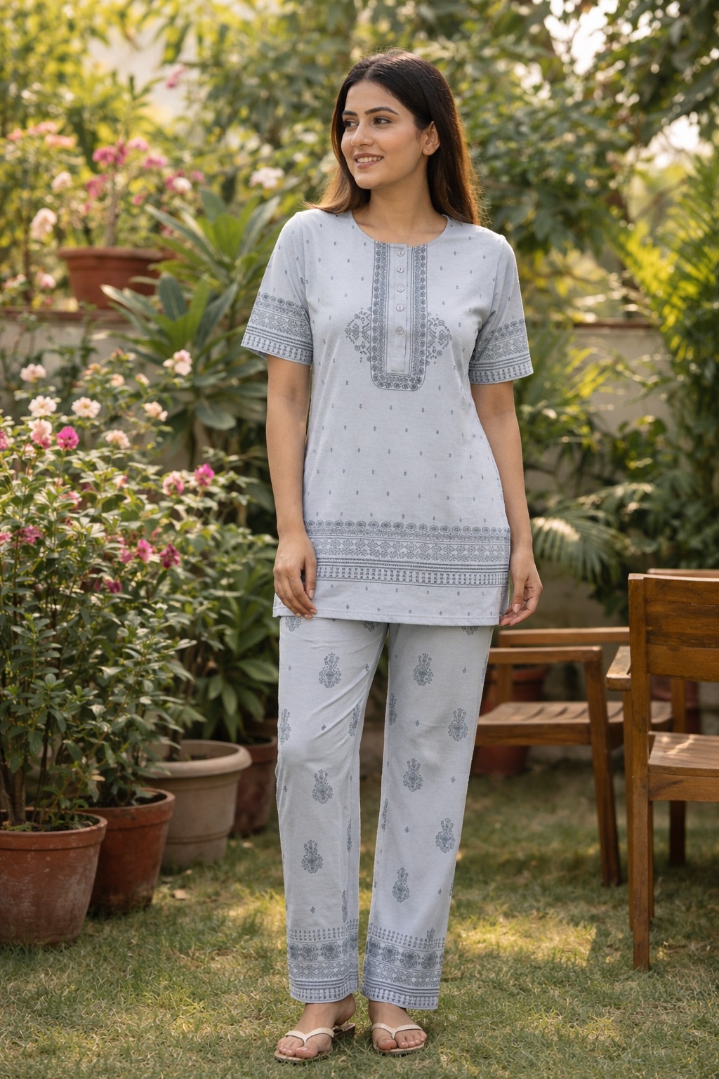 Crafted from breathable, skin-friendly fabric, it ensures all-day comfort while maintaining a stylish look. The coordinated print on both top and bottom enhances the overall appeal, making it perfect for relaxed home wear and casual outdoor moments.