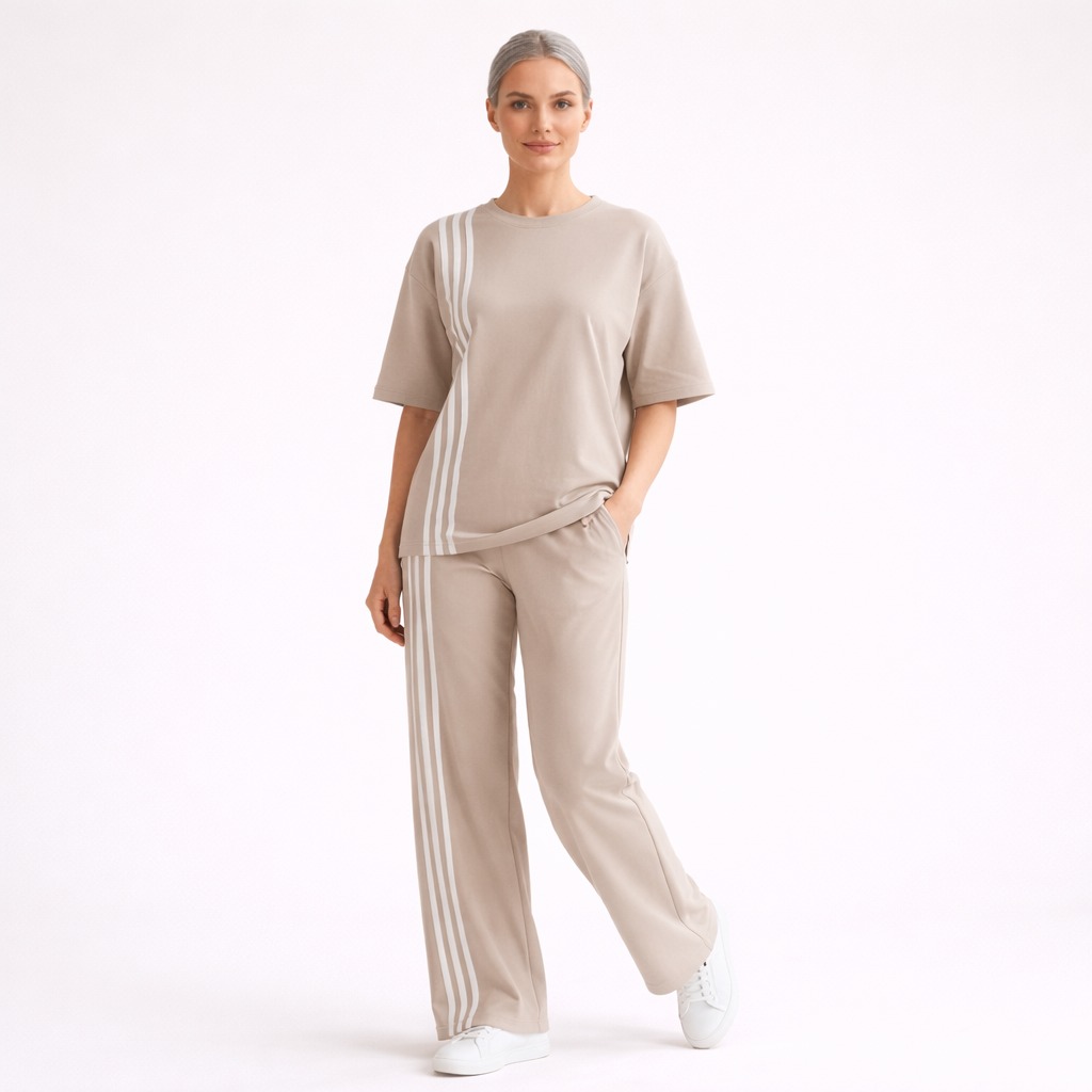 Beige Solid Co-Ord Set with Side Stripes