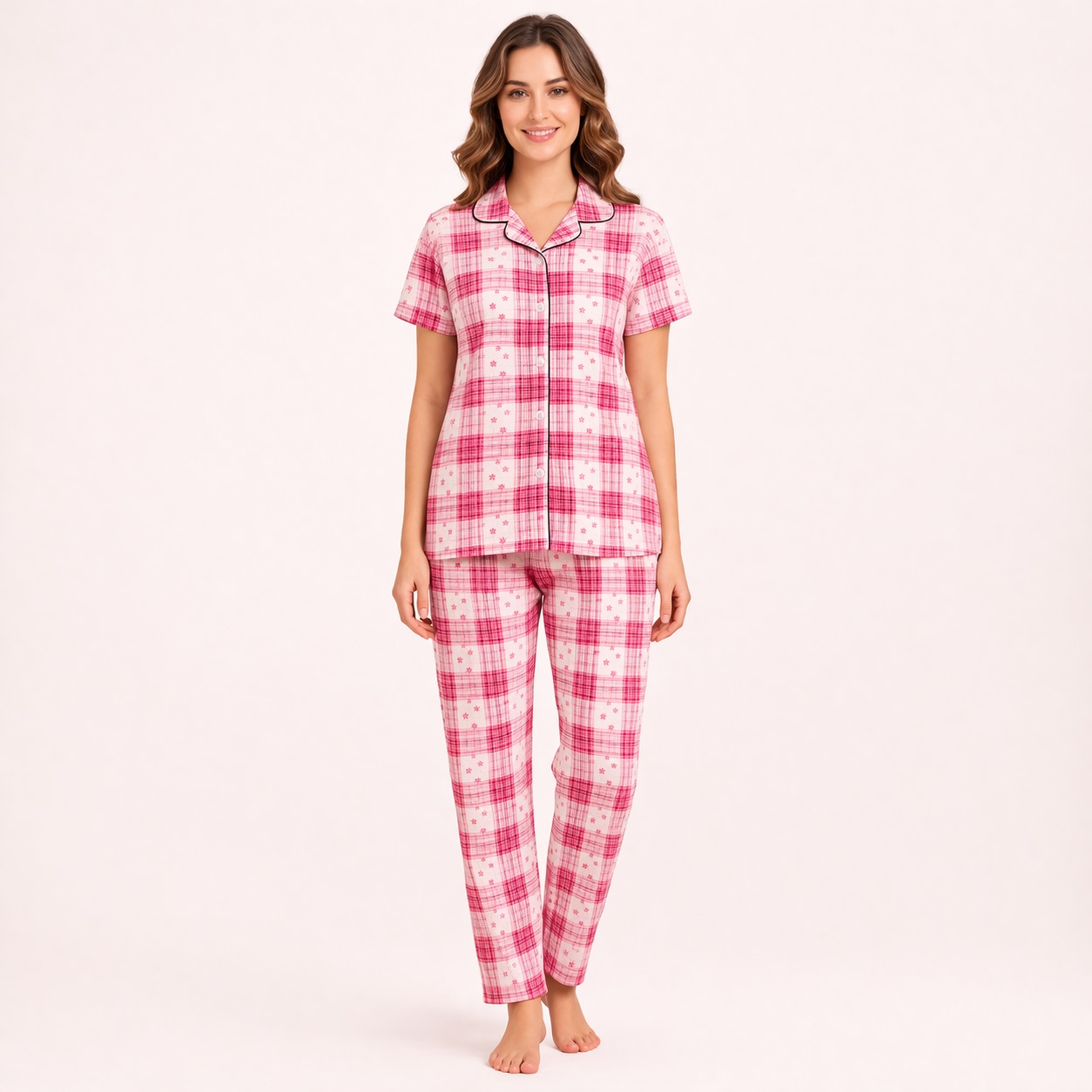 Relax in style with our Luxury Sleepwear Pyjama Set (RNS-2022). Crafted from premium cotton with elegant check prints, this set offers the perfect blend of comfort, breathability, and everyday style.