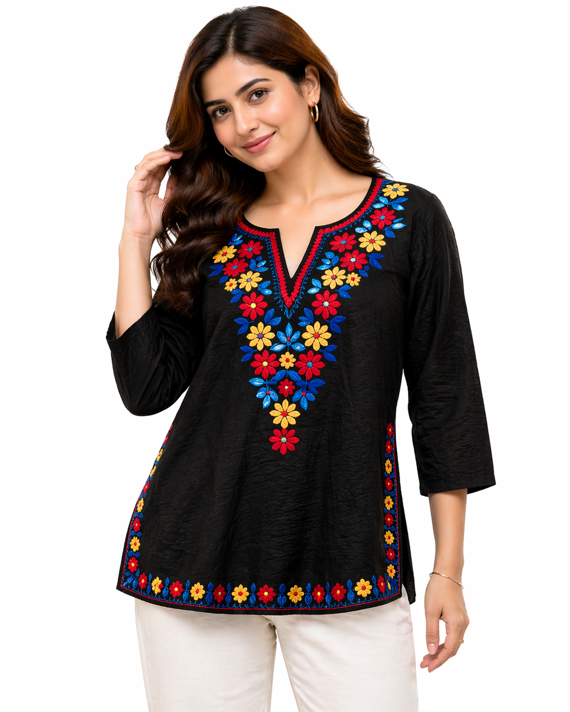 Upgrade your everyday style with this beautifully crafted embroidered top, designed to blend comfort with vibrant elegance. The rich black base enhances the colorful floral threadwork, making it a perfect statement piece for both casual and semi-festive wear.