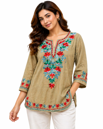 Add vibrant charm to your wardrobe with this beautifully handcrafted embroidered top. Designed with colorful floral thread work on the neckline and front panel, this piece brings a perfect blend of tradition and modern everyday style.