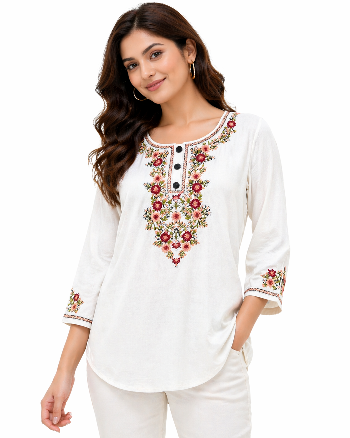 Upgrade your everyday style with this elegant embroidered top designed for comfort and effortless fashion. Featuring intricate floral thread work on the front neckline and sleeves, this piece adds a refined touch to your casual and semi-formal looks.