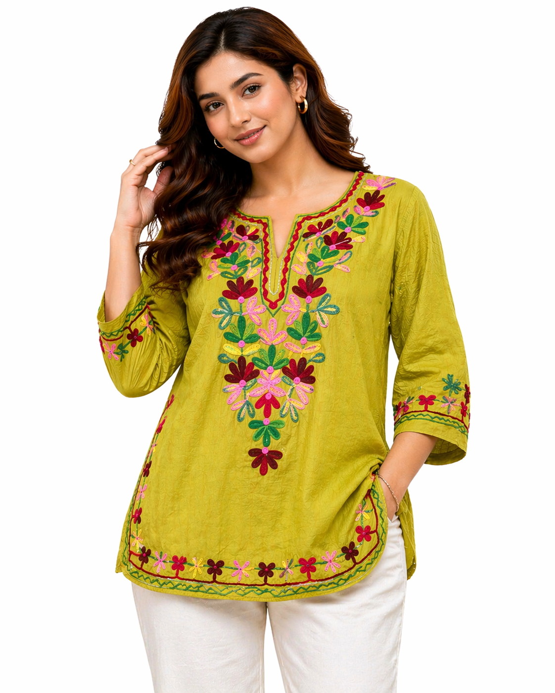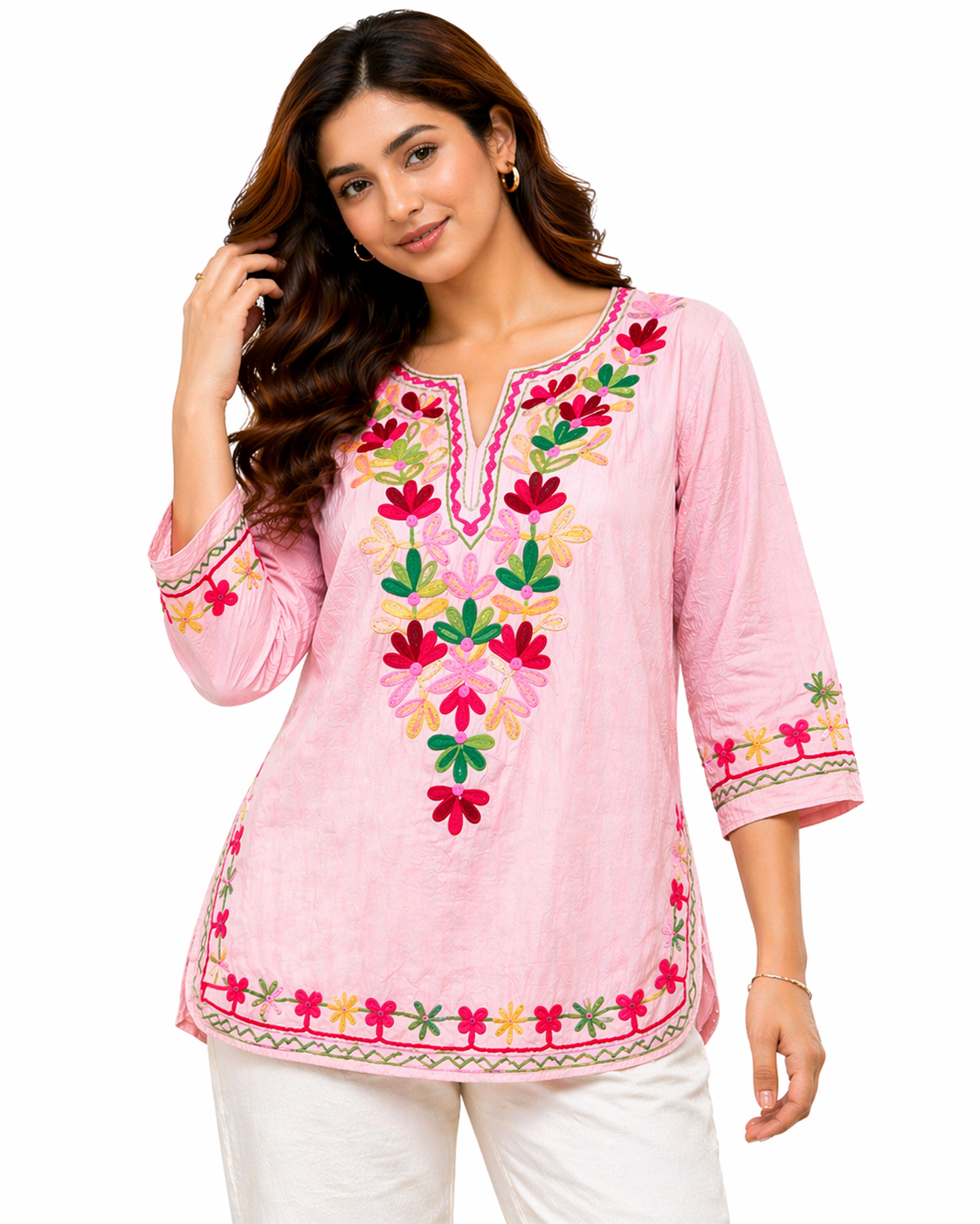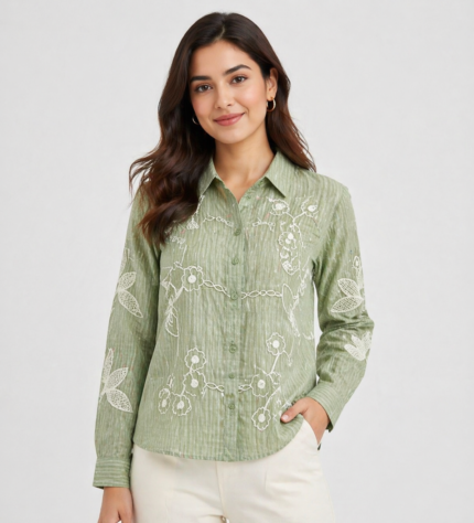 Elevate your everyday style with this elegant floral embroidered top. Designed with beautiful thread embroidery on the front, this shirt offers a premium and graceful look. The soft textured fabric, stylish puff sleeves, and front button detailing make it perfect for casual outings, office wear, and festive styling.
