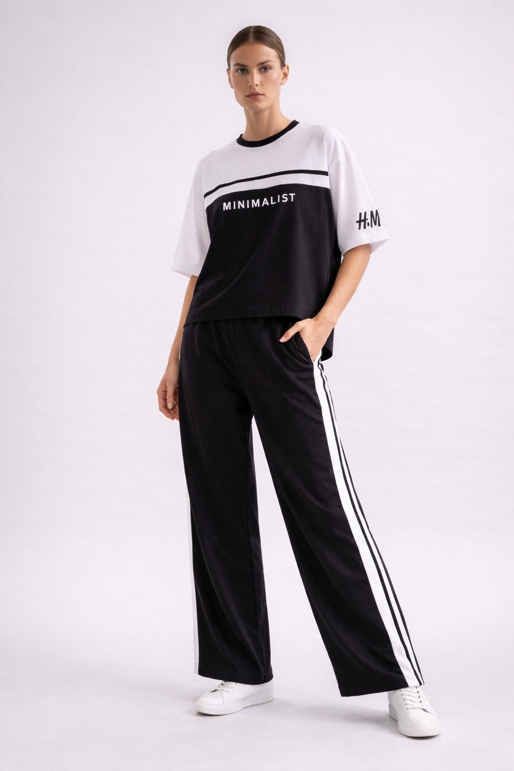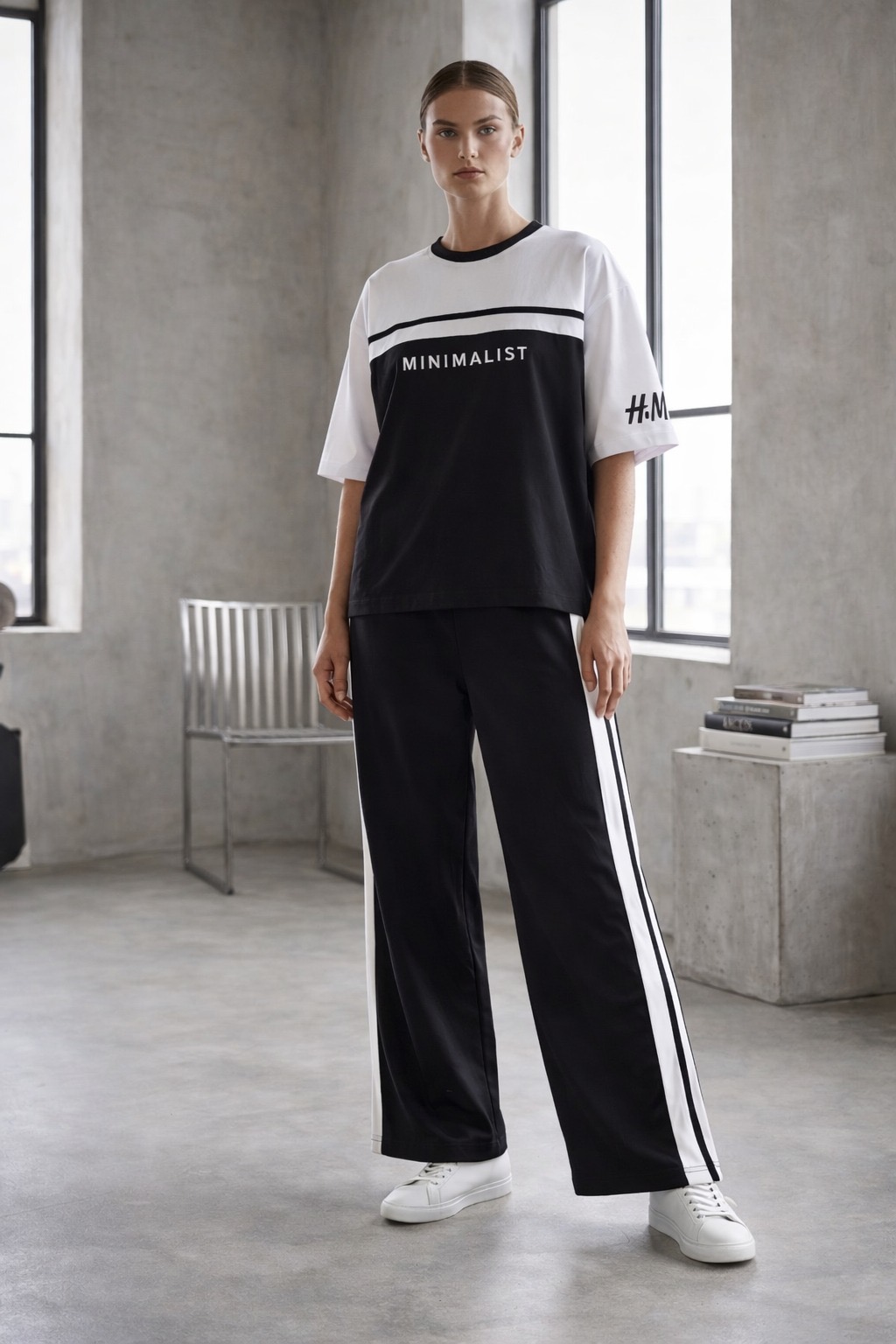 Step into effortless style with this minimalist black & white co-ord set, designed for modern women who love clean and classy fashion. Featuring a contrast panel T-shirt with “Minimalist” print and matching wide-leg pants with side stripe detailing, this outfit blends comfort with a premium aesthetic.