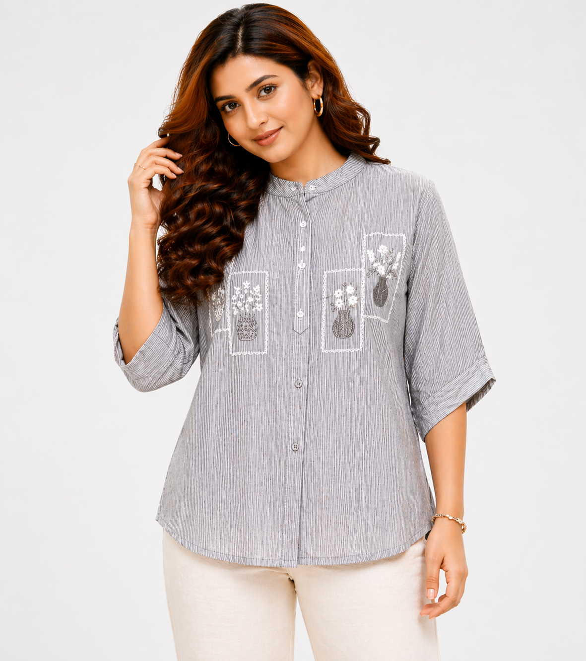 Elevate your everyday style with this elegant floral embroidered top. Designed with beautiful thread embroidery on the front, this shirt offers a premium and graceful look. The soft textured fabric, stylish puff sleeves, and front button detailing make it perfect for casual outings, office wear, and festive styling.