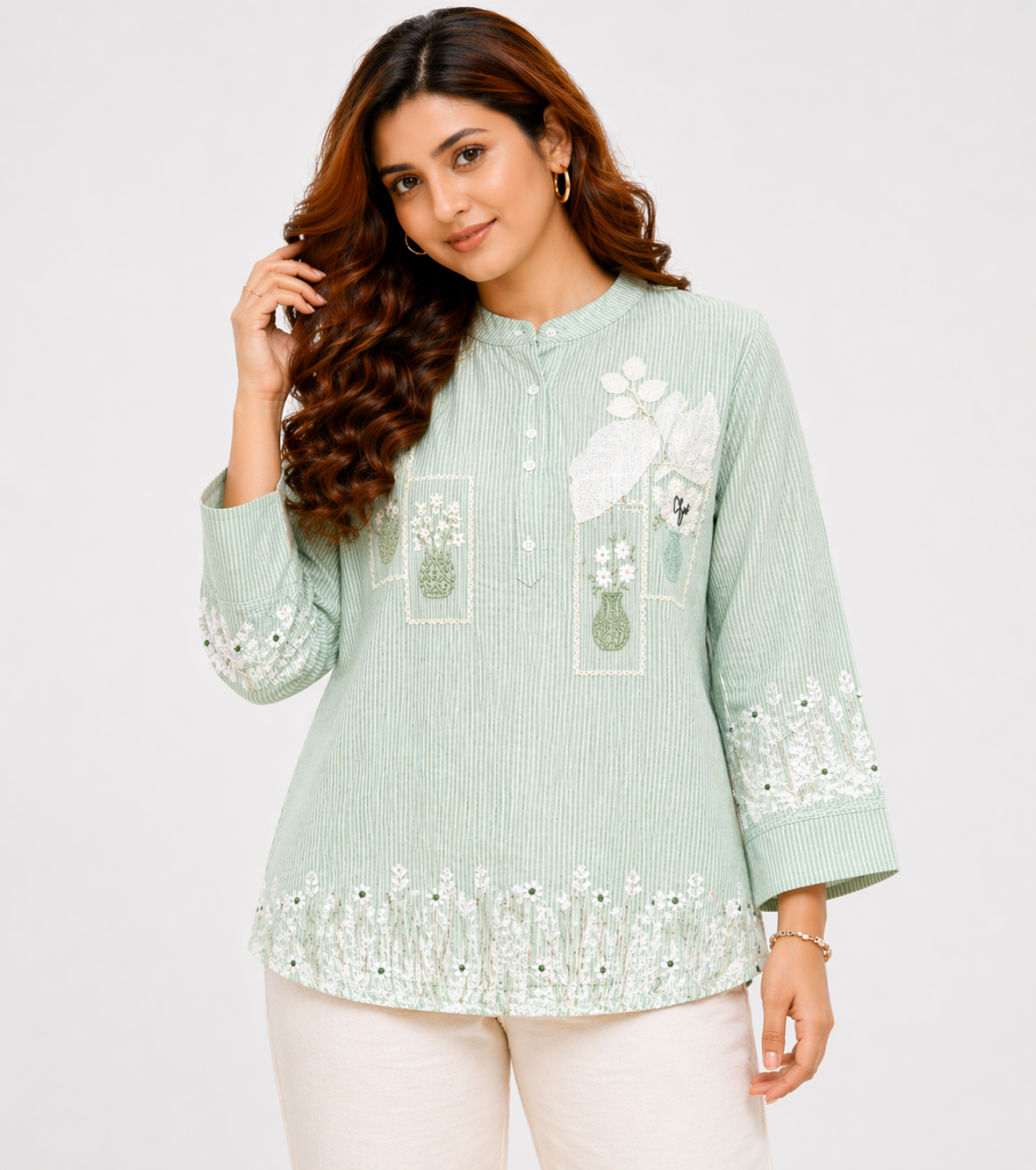 Upgrade your everyday style with this elegant embroidered top designed for comfort and effortless fashion. Featuring intricate floral thread work on the front neckline and sleeves, this piece adds a refined touch to your casual and semi-formal looks.